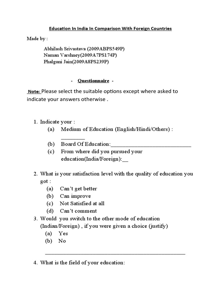 This is a research report on Questionnaire on Indian Education System uploaded by KNT Arasu in category. The community that you will use to answer the questionnaire. Educational institutes run multiple student surveys to gather feedback about various topics.