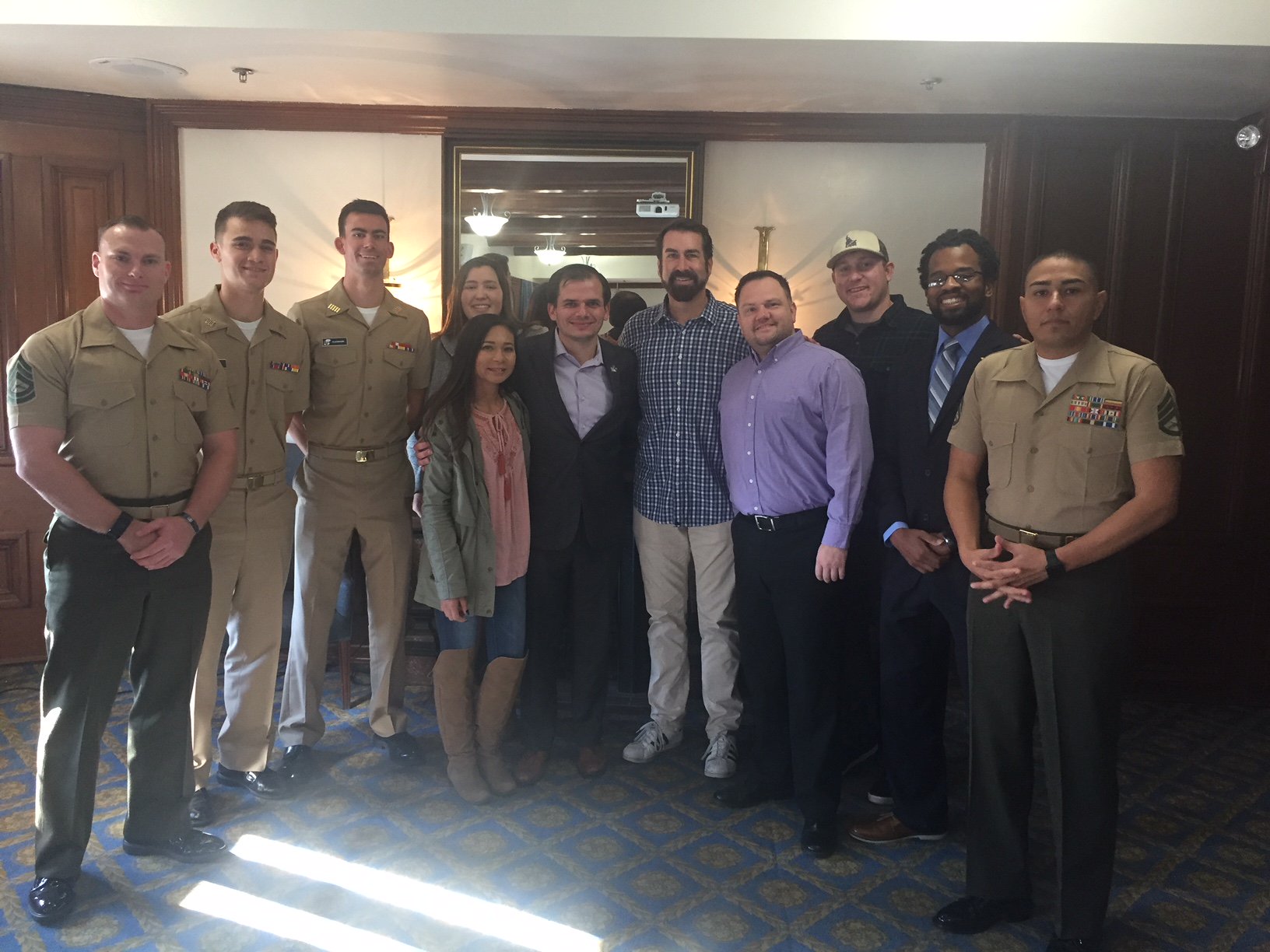 The dual careers worked together though. When not in uniform he wears a maroon polo shirt with a golden wings symbol on it blue-gray jeans similar to. After recruiting Marine Corps veteran Rob Riggle the Veterans.