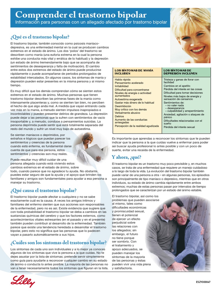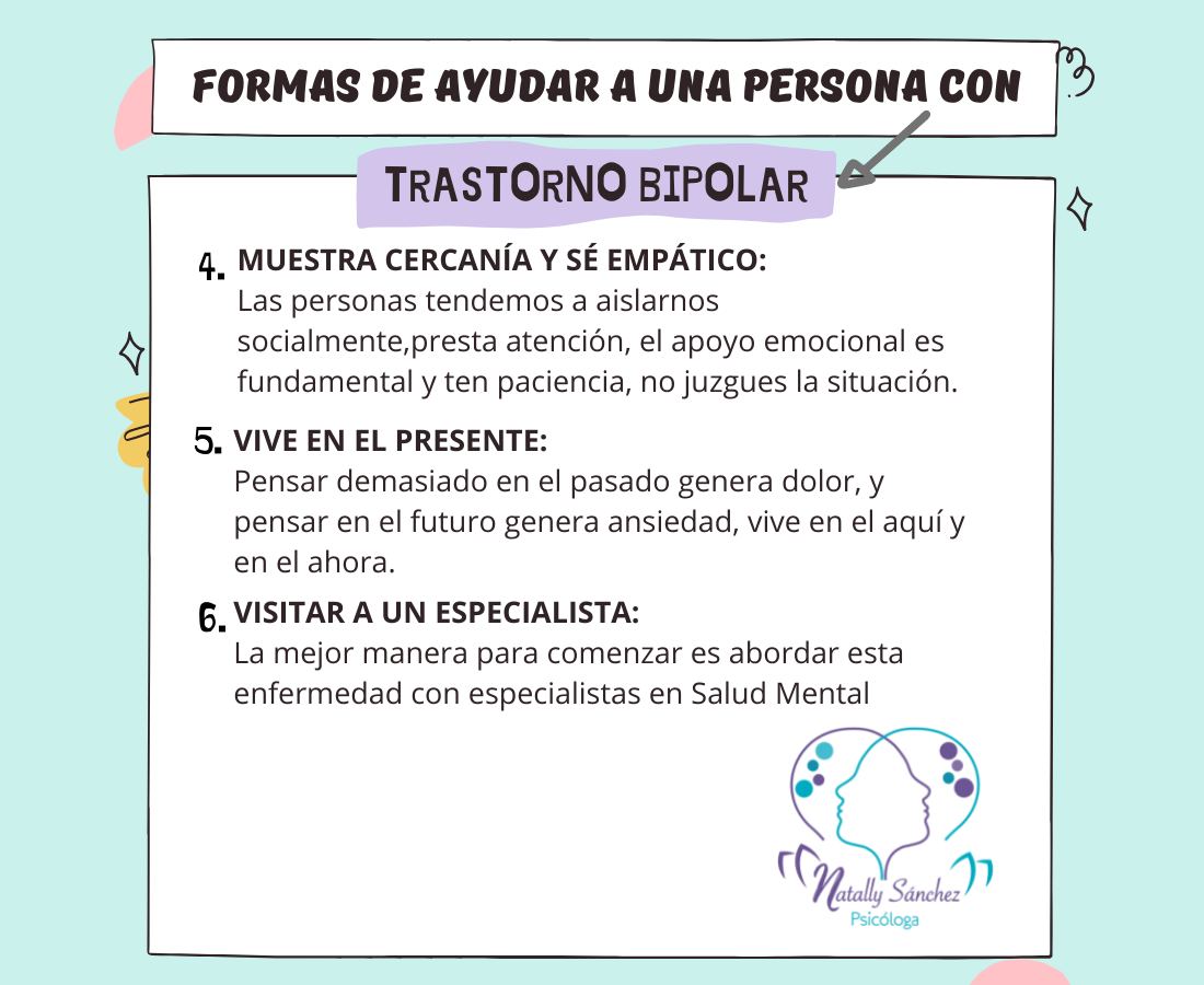 No olvide que siempre hay una persona detrás del diagnóstico y de la enfermedad. En sus fases depresivas debes fomentarlo a realizar actividades físicas o de su agrado y dispensarle cariño. 10 formas de ayudar a una persona con trastorno bipolar Infórmate Lo primero de todo es entender qué es y en qué consiste el trastorno bipolar.